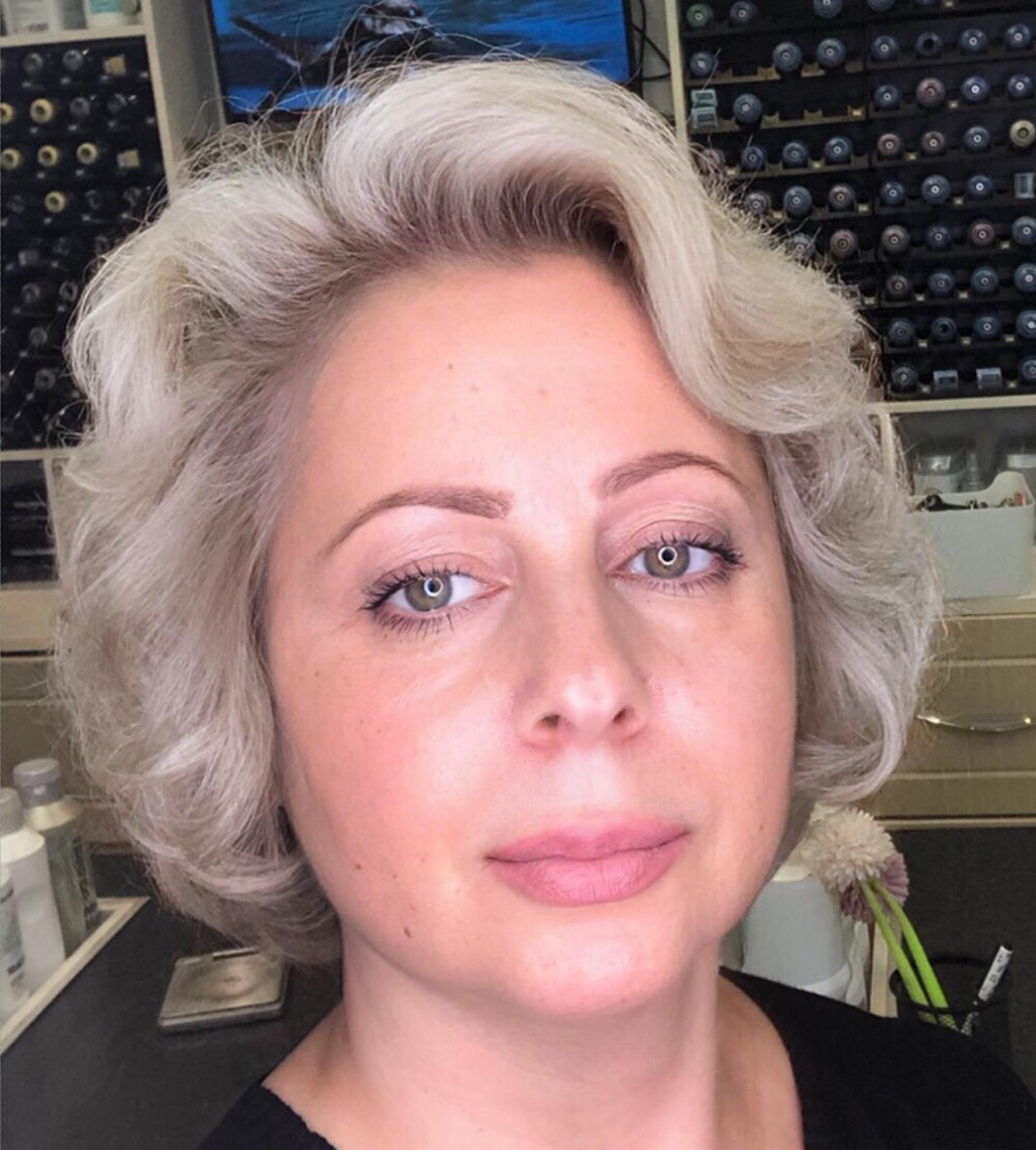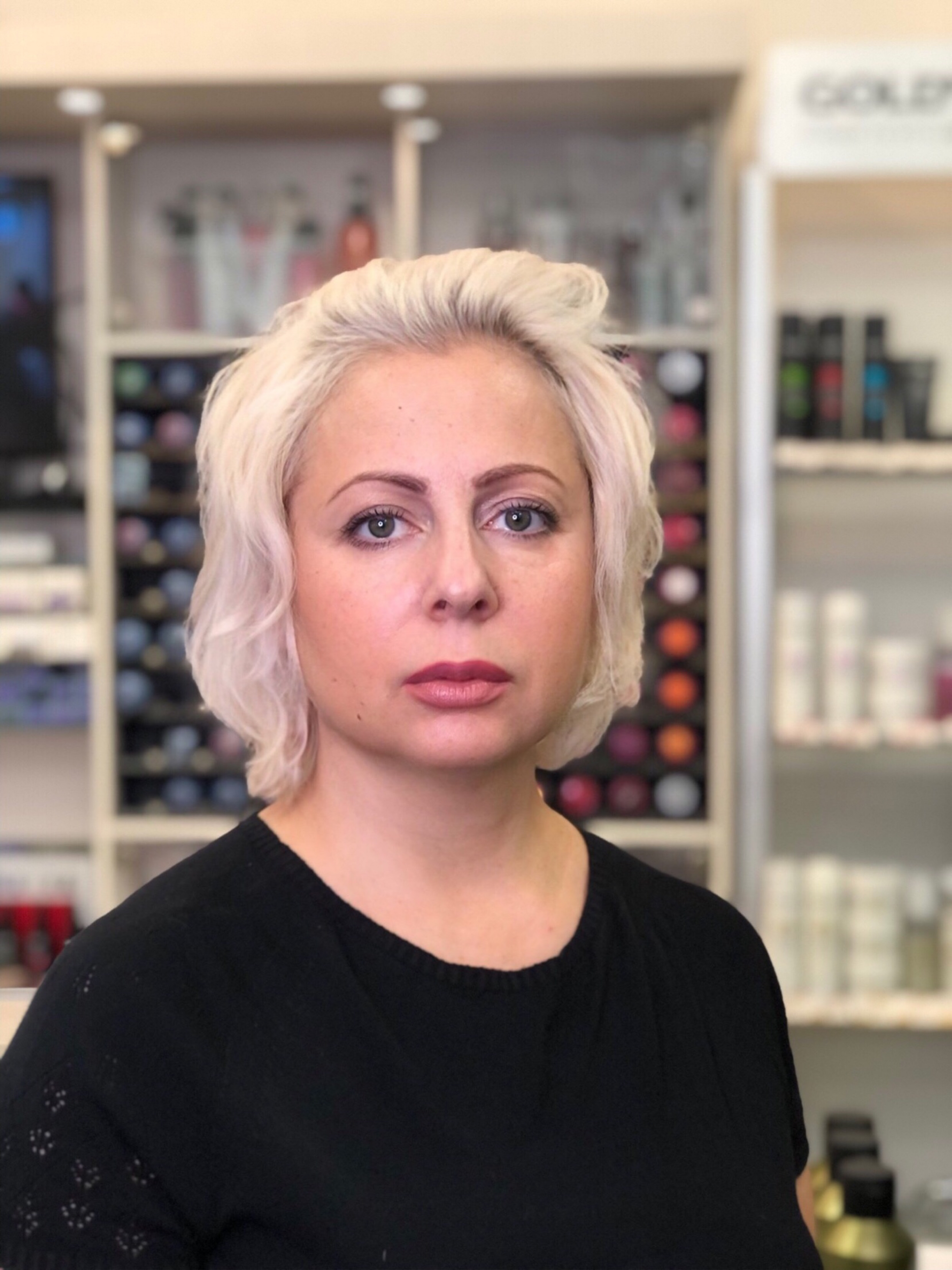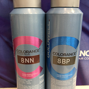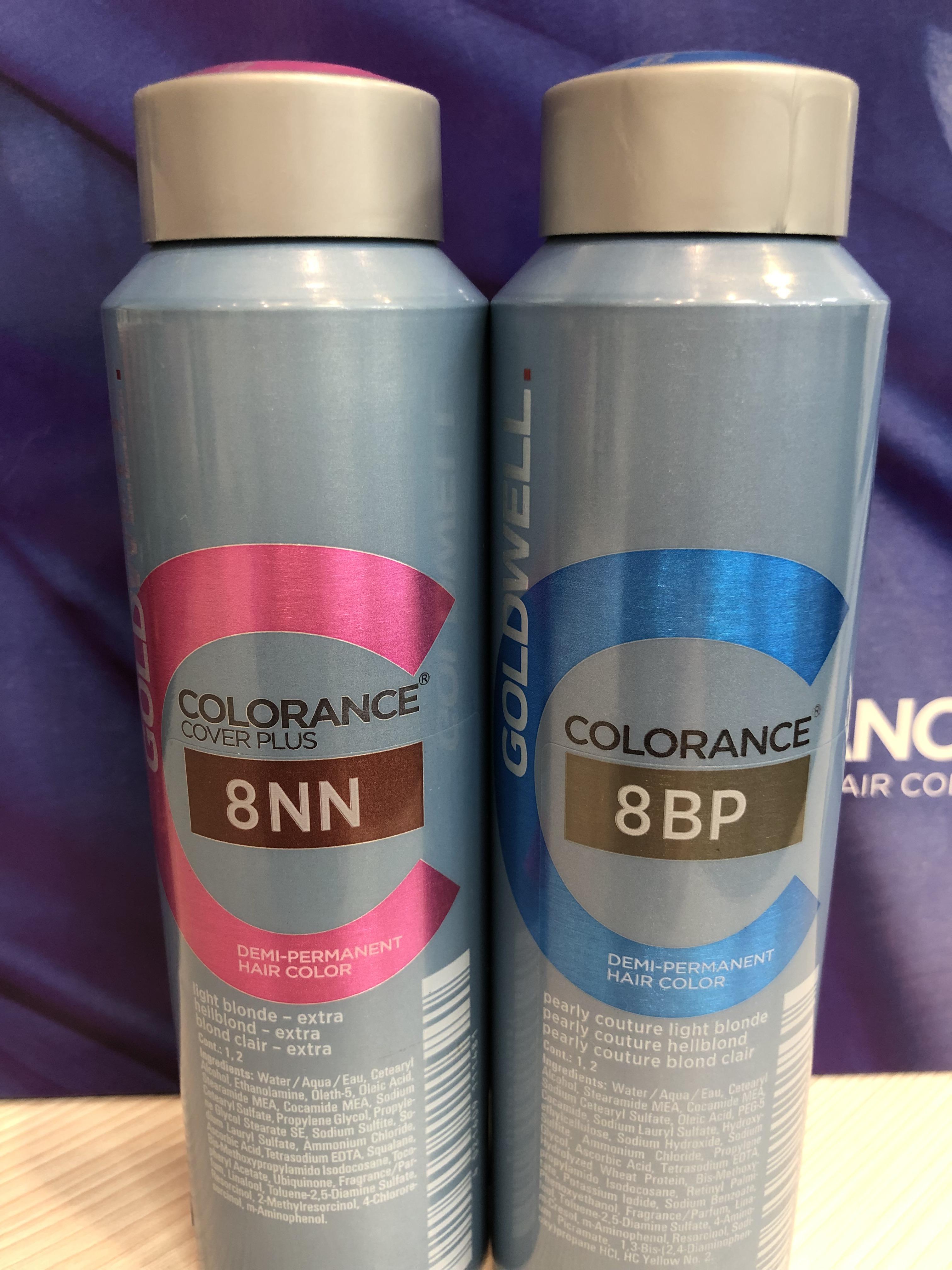 Для выполнения этой задачи мастер выбрала полуперманентный краситель бренда Goldwell Colorance в сочетании двух оттенков: 8BP- светло жемчужный блонд и 8NN-натуральный блонд. Легкая формула этого красителя позволит сохранить структуру волос и в то же время хорошо закрасит седину. Длина была затонирована тем же рецептом.